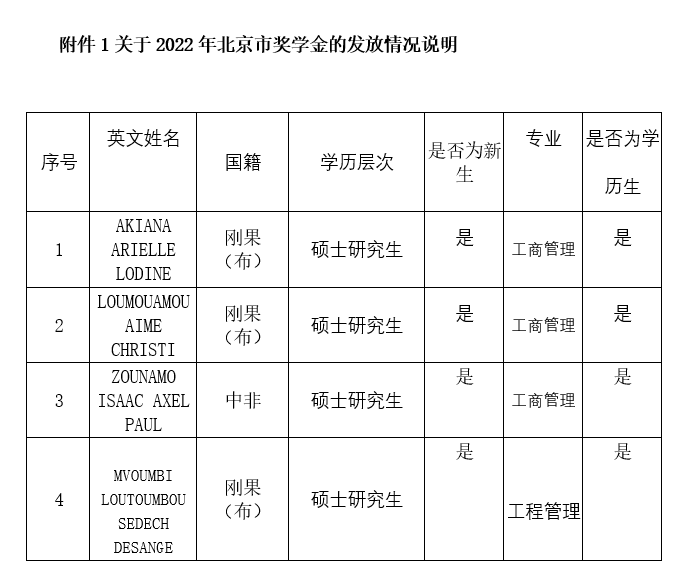 根据《中国矿业大学(北京)执行北京市外国留学生奖学金项目的实施办法》,经来华留学生个人申请,国际合作与交流处初评,学校奖学金评审委员会评审,最终认定刚果(布)籍AKIANA ARIELLE LODINE等4名留学生获得2022年度北京市外国留学生奖学金(名单详见附件1)。