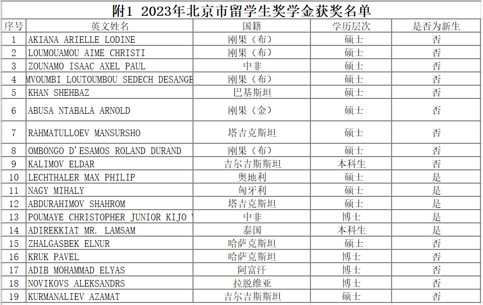 根据《中国矿业大学(北京)执行北京市外国留学生奖学金项目的实施办法》,经来华留学生个人申请,国际合作与交流处初评,学校奖学金评审委员会评审,最终认定刚果(布)籍AKIANA ARIELLE LODINE等19名留学生获得2023年度北京市外国留学生奖学金(名单详见附件1)。