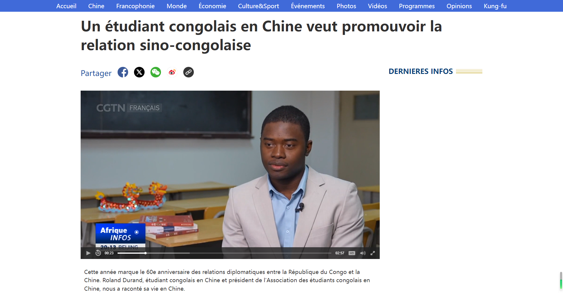 今年是刚果共和国与中国建交60周年。2月22日,国家主席习近平同刚果(布)总统萨苏互致贺电,庆祝两国建交60周年。近日,中国矿业大学(北京)刚果共和国留学生Roland Durand(罗兰达)作为优秀在京留学生代表接受中国国际电视台采访,讲述他在中国的生活。