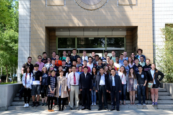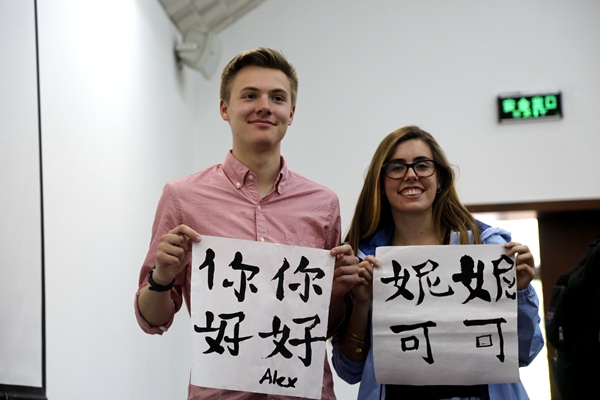 两校学生在热烈友好的气氛中进行了交流,并相互介绍了各自的历史和文化。随后,我校学生陪同宾州州立大学学生参观校园,并现场表演书法。