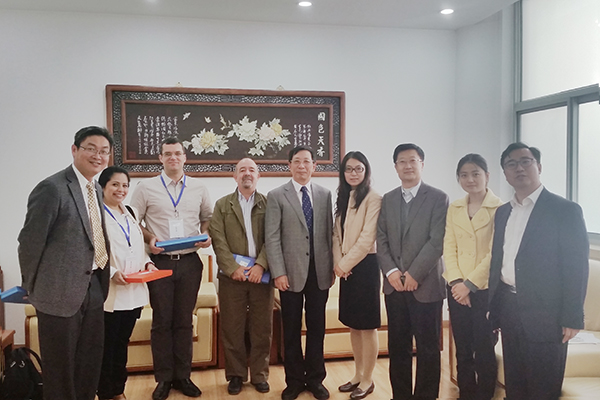 10月12日,第14届国际水泥化学大会专家团,西班牙Eduardo Torroja建筑科学研究院Angel Palomo教授、英国谢菲尔德大学JohnProvis教授和Susan A. Bernal研究员、澳大利亚南昆士兰大学Hao Wang教授应邀来我校作学术交流,副校长姜耀东会见了来访专家,国际合作与交流处处长王红梅、化学与环境工程学院王栋民教授、刘泽副教授等参加了会见。