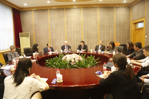 5月21日下午,英国利兹大学校长Alan Langlands爵士携该校副校长Hai-Sui YU教授、教育、社科及法律学院副院长Norma Martin Clement教授、环境学院副院长Bill Murphy博士、国际处处长Jacqui Brown女士、国际处市场部主任Julia Wang女士、校际项目主管Lulu Pan女士、项目专员李晓晨女士来我校访问。校长杨仁树会见了代表团,参加会谈的还有副校长朱书全,化环学院、力建学院、文法学院以及国际合作与交流处相关人员。