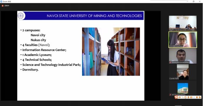 2022年11月30日上午,我校与乌兹别克斯坦纳沃伊州立矿业技术大学(Navoi State University of Mining and Technologies,NDKTU)代表团进行线上会谈。该校Alikulov Shukhrat Sharofovich副校长、国际处、采矿工程学院、能源与机械工程学院、冶金与化学工程学院、农业学院相关人员参加了会谈。我校国际合作与交流处工作人员参加了会谈。