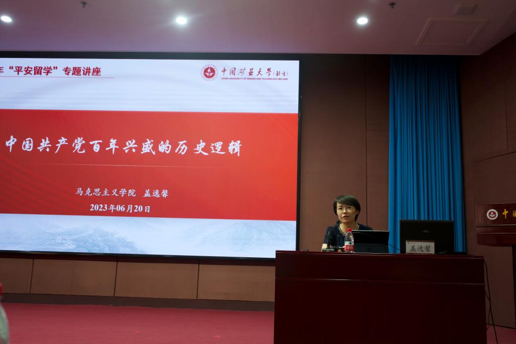 盖逸馨教授以“中国共产党百年兴盛的历史逻辑”为主题从党史角度出发开展思政教育,从先辈们的鲜活案例引申到当前国际形势。她强调各位学子作为中国大学生的使者,要坚守正确的价值观念,在国外树立良好的形象,传播中国优秀文化。