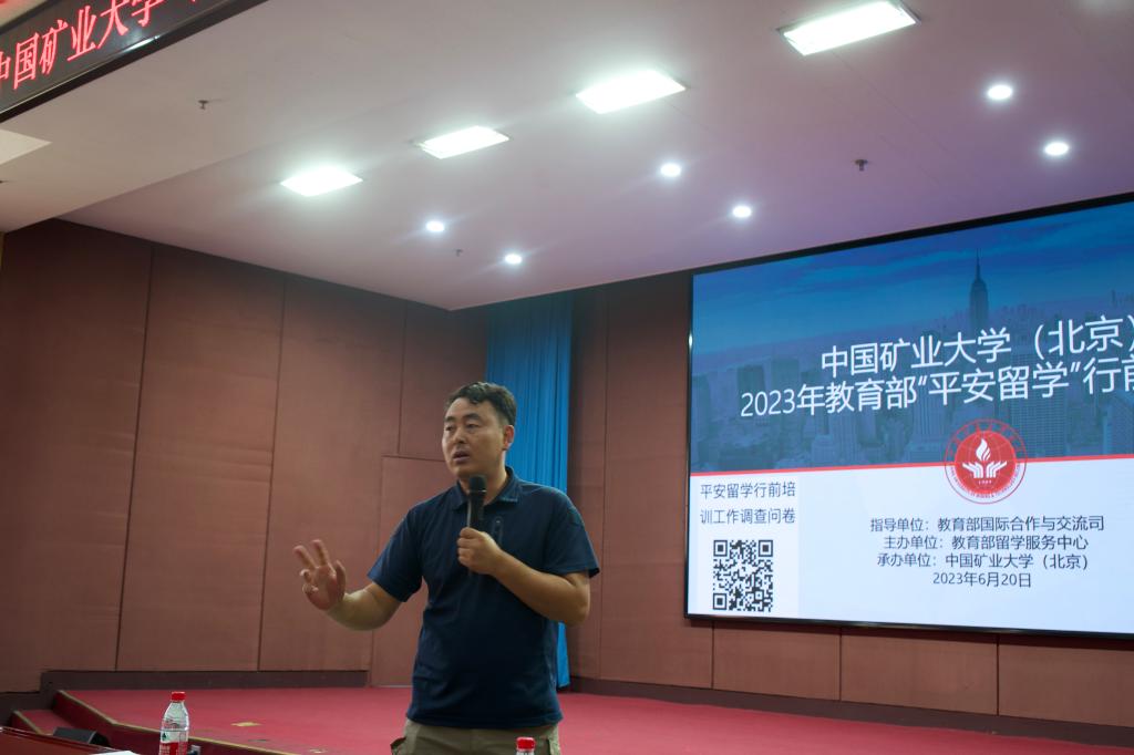 本网讯 6月20日,由教育部国际合作与交流司指导、教育部留学服务中心主办、中国矿业大学(北京)承办的2023年教育部“平安留学”行前培训在我校举行,全校近60名国家公派、校际交流和自费留学的教师及学生参加了培训。德威集团窦杨教官、国家安全部门孙警官、我校心理中心刘海娟研究员、马克思主义学院盖逸馨教授、文法学院王红梅教授等专家以及我校国际合作与交流处、保卫处等部门相关领导和工作人员出席本次培训会。