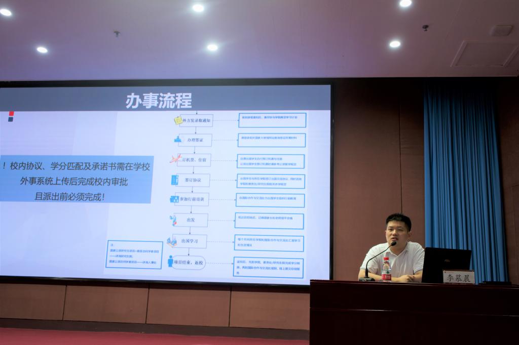 最后,国际合作与交流处交流项目科李慕晨向参会师生介绍了校际项目的行前申报流程,以及行李准备、入境须知等方面注意事项,同时介绍了教育部留学服务中心平安留学在线培训平台等线上资源,祝愿与会各位都能顺利完成留学目标,收获宝贵的经验,平安归来。