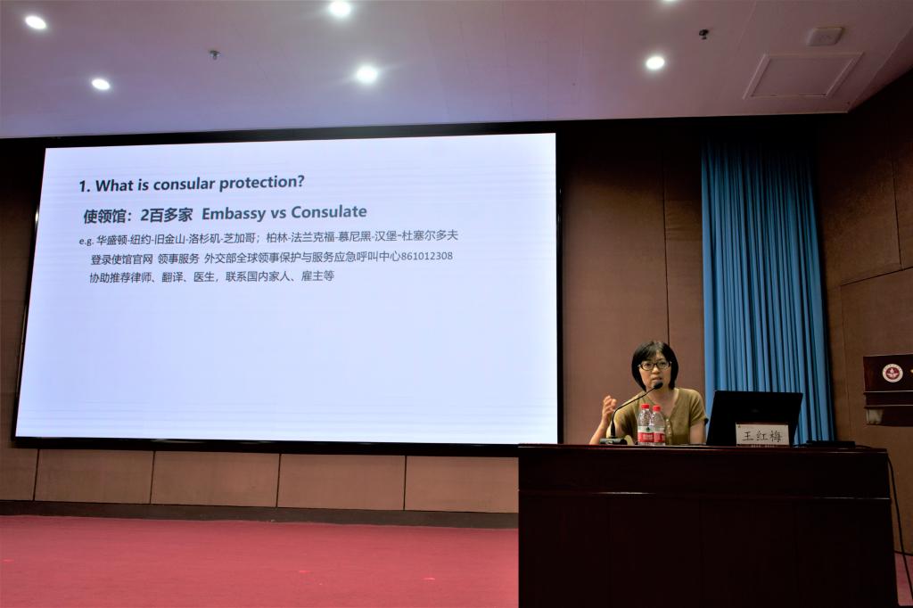 王红梅教授分享了她在领保方面的经验,并介绍了在国外应具备的个人安全意识和法律意识。她提醒学生们要了解所在国家的法律法规,遵守当地的法律规定,做到守法自律、合法合规。她分享的内容生动有趣,为学生们提供了领保方面的重要指导。