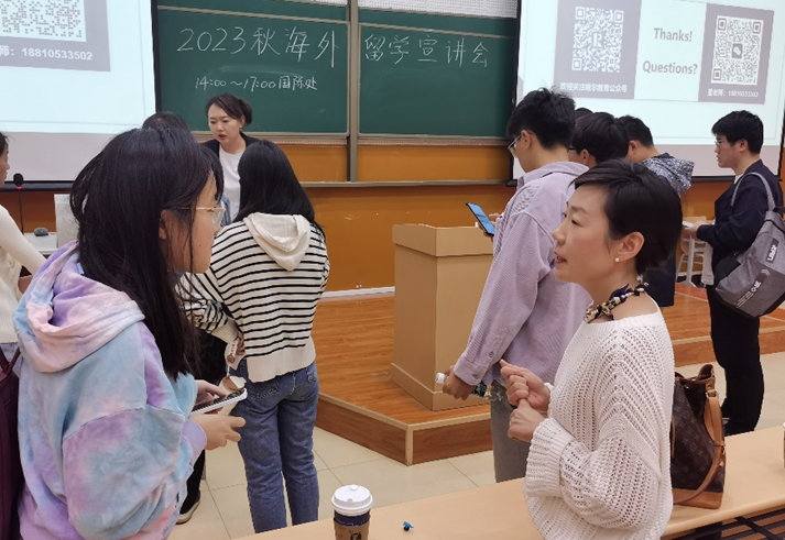 教室内座无虚席,参加同学认真听讲积极提问,并向海外高校代表咨询自己感兴趣的留学项目,受邀高校代表则热情细致地进行解答和项目推介,现场交流气氛热烈活跃。