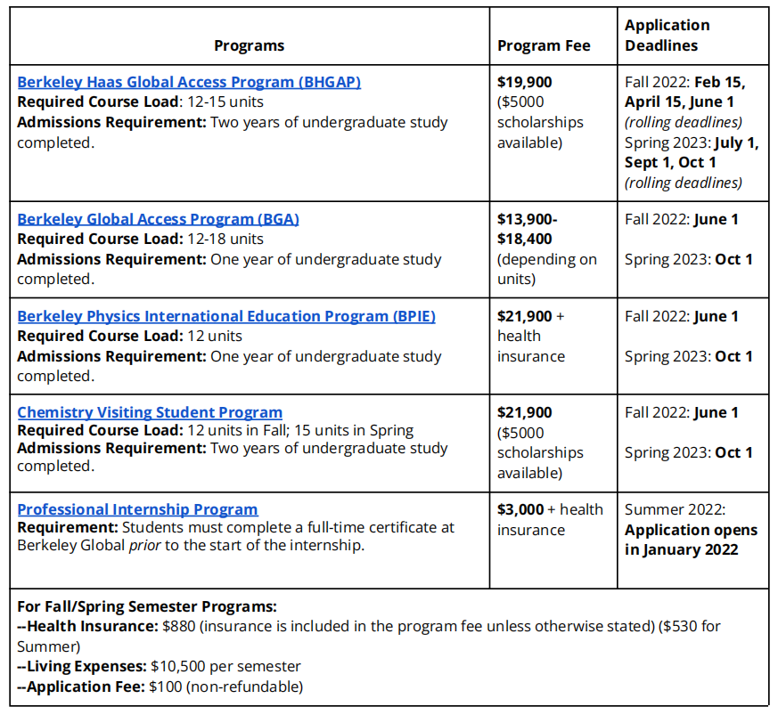 加州大学伯克利分校提供的为期一学期或一年的交流项目可以使国际本科生或研究生充分体验作为伯克利学生的生活,学生可学习商业、科学、工程等学科,可获得尖端研究和技术、与知名教授进行学术交流。项目类别、费用及申请截止日期如下(详情请见附件):