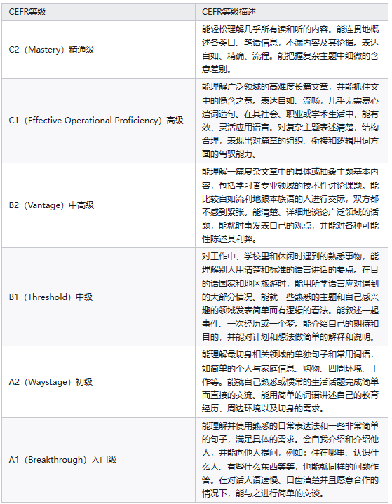 等级标准参考《欧洲共同语言参考框架-CEFR》