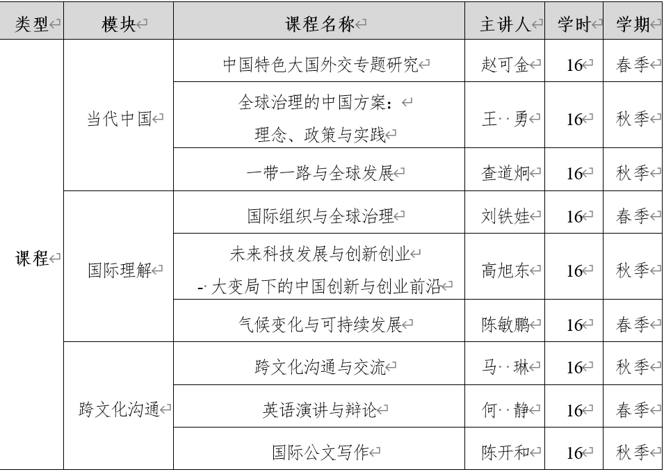 “课程”由“当代中国”、“国际理解”、“跨文化沟通”三个模块构成,包含9门选修课程、9场系列讲座、共计约160学时。学生可根据自身情况灵活选择;“实践”包含国内外调研考察、深度参访、研修研学、实习实训等9项系列活动。