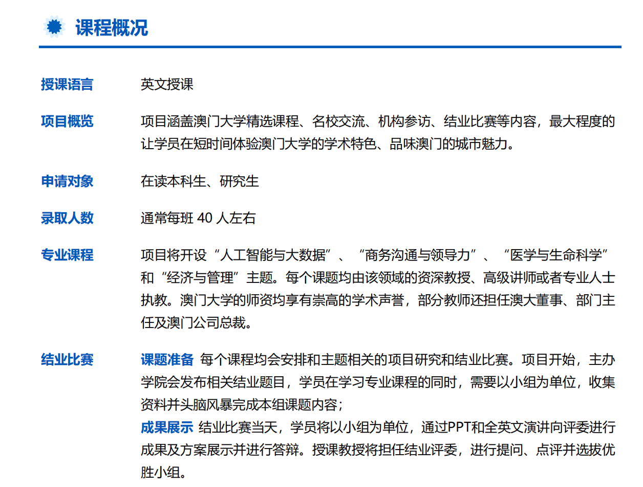备注:项目由澳门大学指定第三方罗客教育集团组织,具体事宜由该集团负责,学生须仔细了解项目详情后,根据个人需求决定是否报名,并在缴费前与该机构签订具体协议,约定课程、退费等事宜。