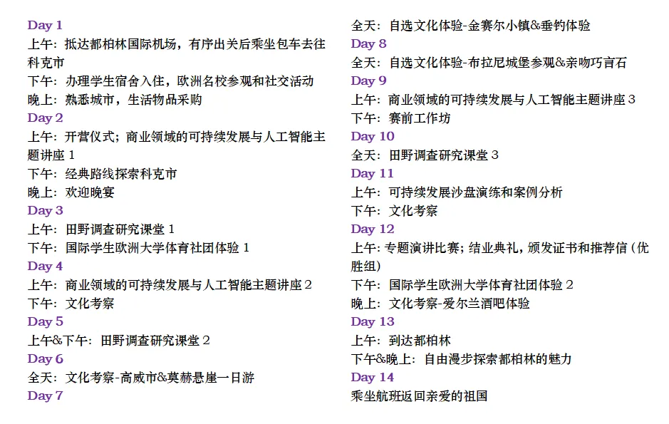 2025年“一国三地”欧洲硅谷的可持续商业密码暑期研学营是爱尔兰国立科克大学商学院主办的官方项目。以“探究式学习”作为设计理念,通过与商业大咖教授一起做课题研究、SDGs沙盘演练、与导师和博士生一起涉足爱尔兰特色地貌进行田野调查等环节,同学们会深入了解可持续发展和人工智能在爱尔兰商业经济场景下的应用。