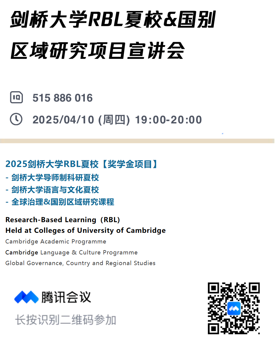 剑桥大学RBL夏校课程,为有志在学科领域进行深入研究的学生提供科研平台,采用剑桥大学导师制方式授课,激发学生的潜在能力。项目均为期2周,全程住宿在剑桥大学宿舍,沉浸式研究和学习,项目面向全球开放申请,学员在导师的带领下共同参与研究项目,同时在剑桥大学参与多彩的文化活动、参观学院或研究机构,获得剑桥大学相关学院颁发的结业证书、成绩单、导师推荐信等。